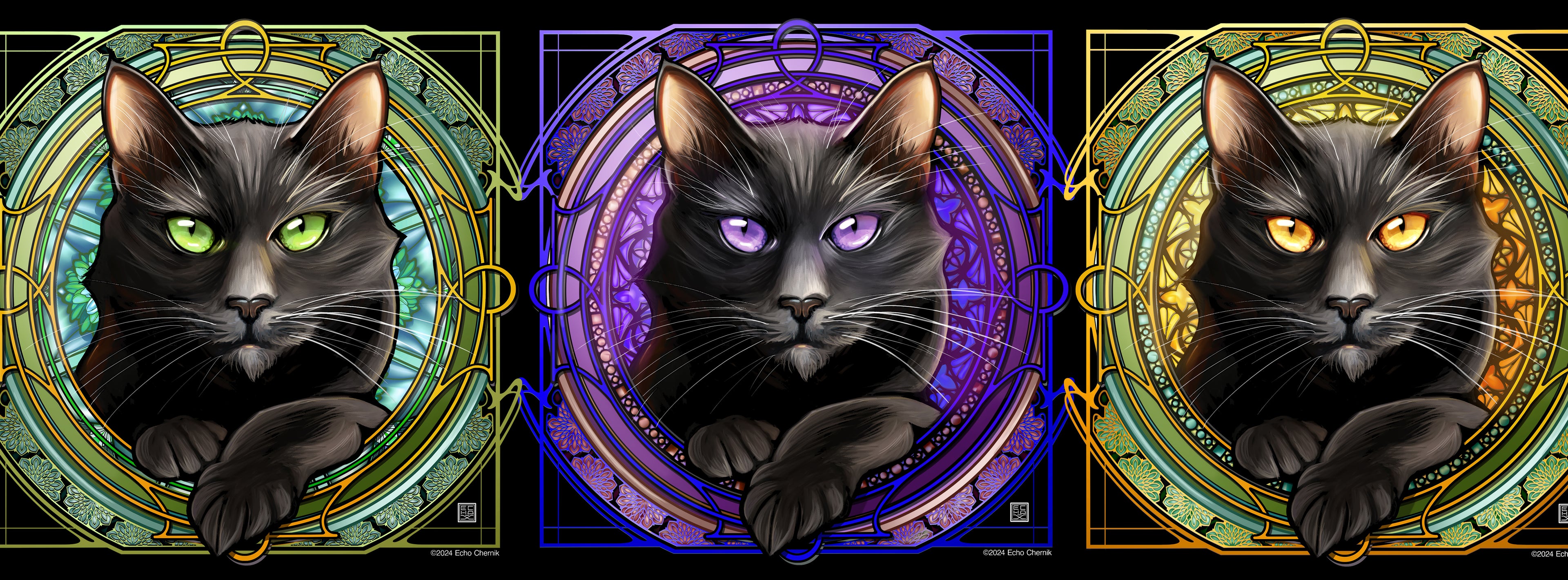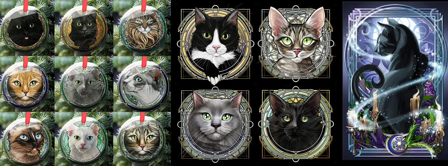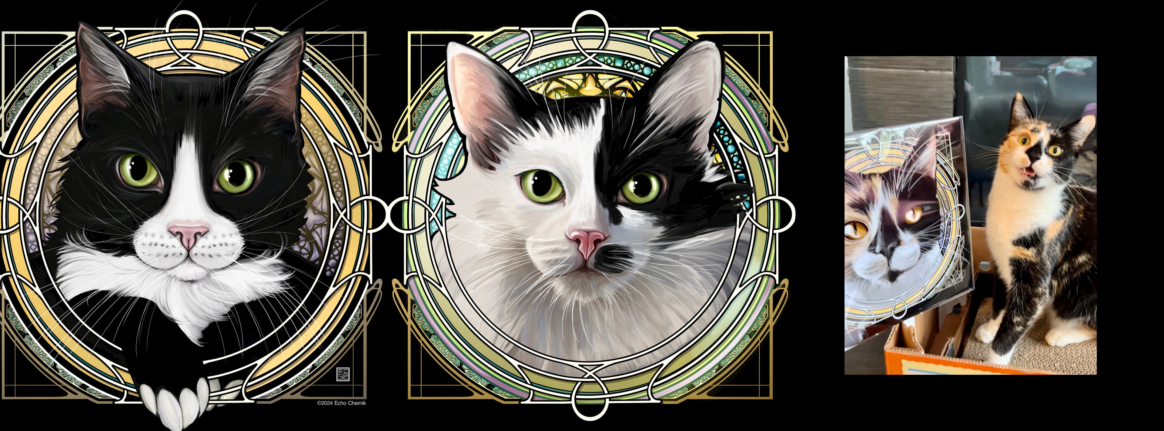 Hi! This is Echo. I've been a professional advertising illustrator and cat lover for many, many years. Welcome to my new brand. All my art nouveau cats are painted by me, no AI used. Yes, I do commissions. I make all of the ornaments and products here in my studio here in Bellingham, WA.