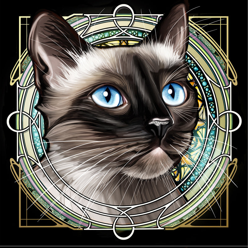 A beautiful painted art nouveau portrait of a cat with a rose window in the classic art nouveau style. Painted by the artist Echo Chernik - no AI (real human art).